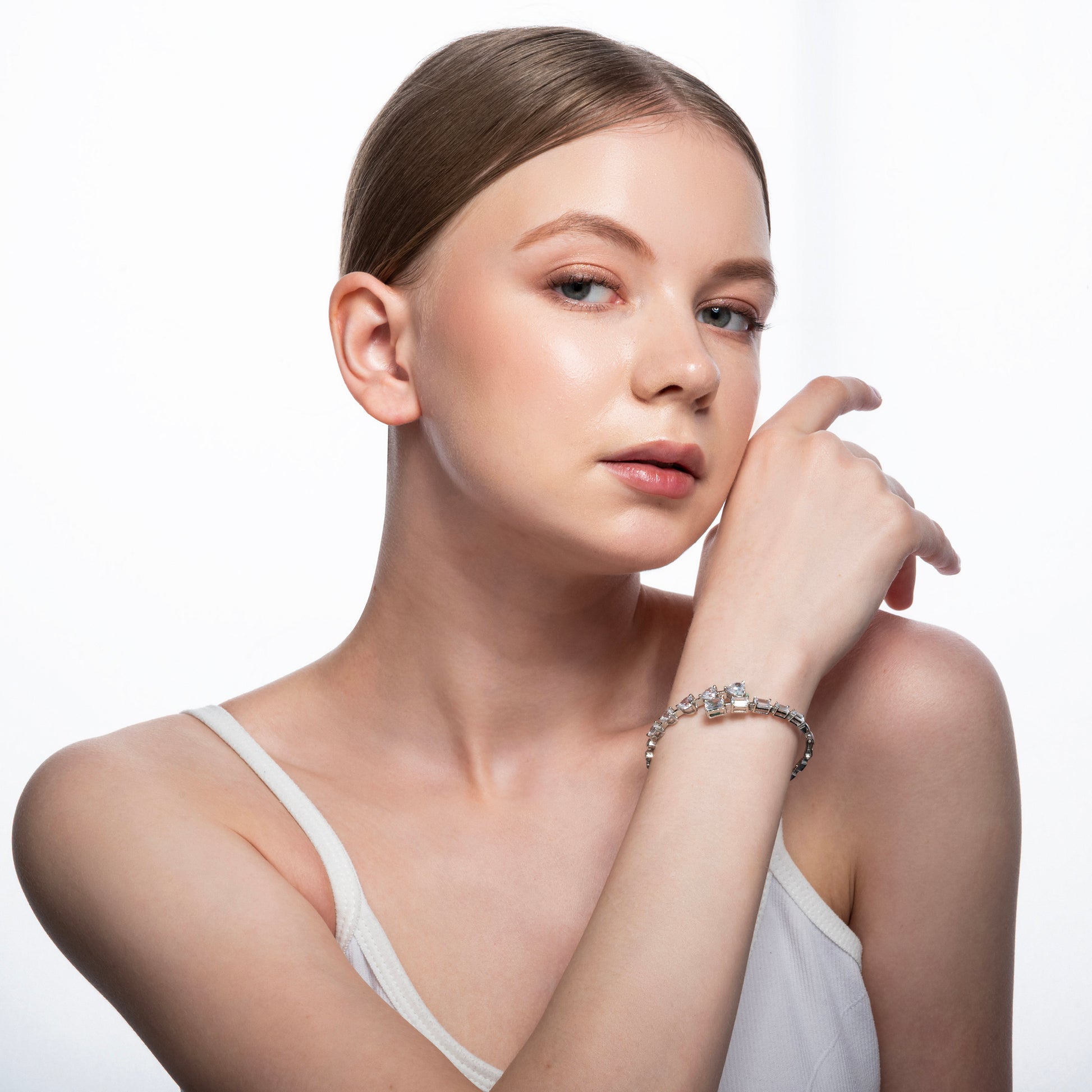 • Luxury rhodium-plated metal bracelet featuring heart and rectangular-shaped zirconia solitaires