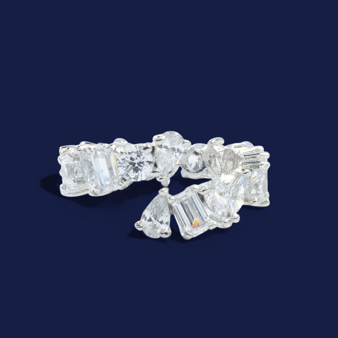 • Exquisite 92.5 silver statement ring featuring a luxurious arrangement of mixed solitaire Swarovski crystals in princess cut, baguette, marquise, and pear shapes