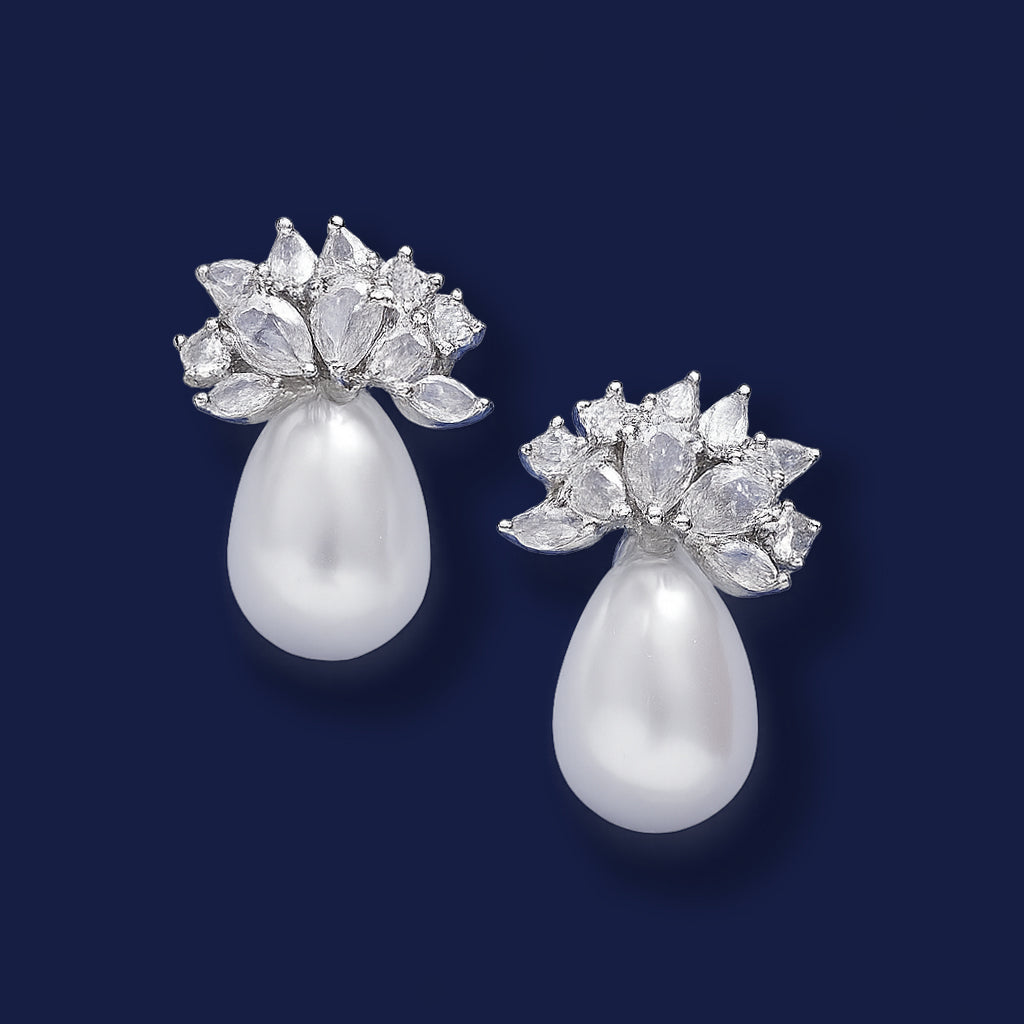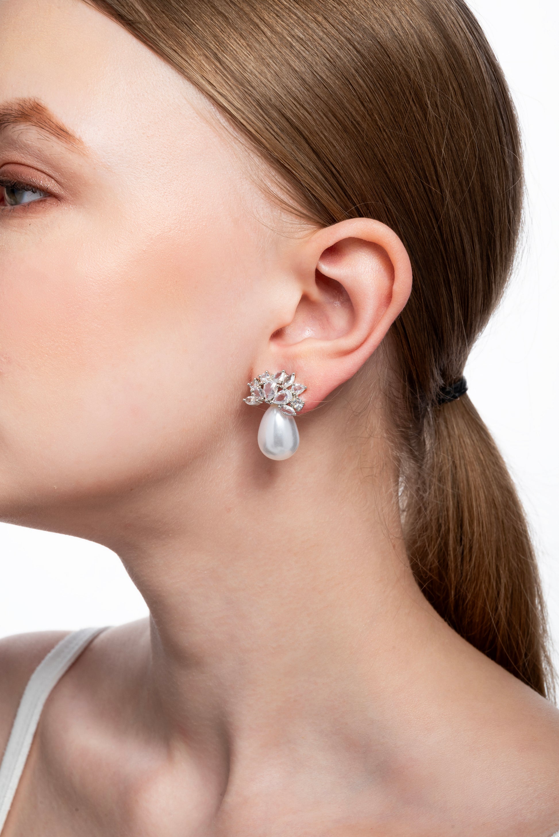 • Elegant rhodium-plated metal earrings featuring a pearl drop accented by clustered Swarovski solitaires